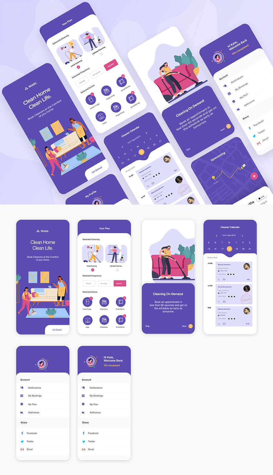 y1419-xd家政紫色UI设计启动页首页个人中心页日历页APP极简大气设计素材源文件下载