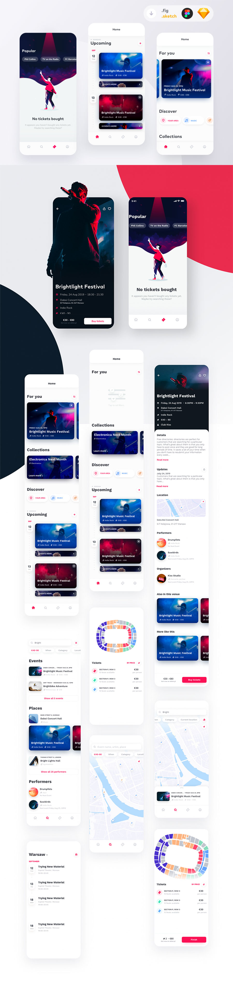 y1766-sketch演出购票红色UI设计登录页首页购票页订单页APP简洁设计素材源文件下载