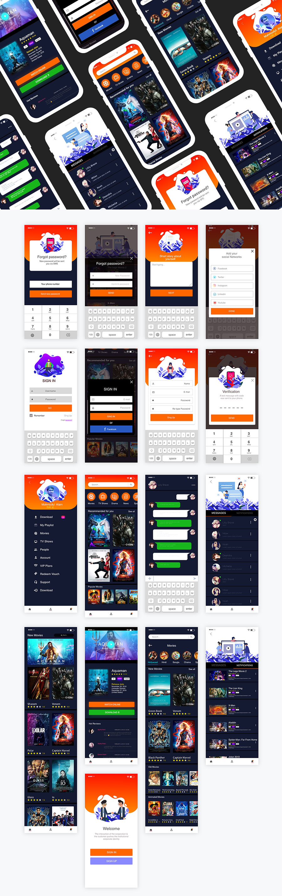 y2485-xd电影橙色黑色UI设计登录页注册页设置密码页菜单页首页里聊天对话页搜索页列表页APP高端大气设计素材源文件下载