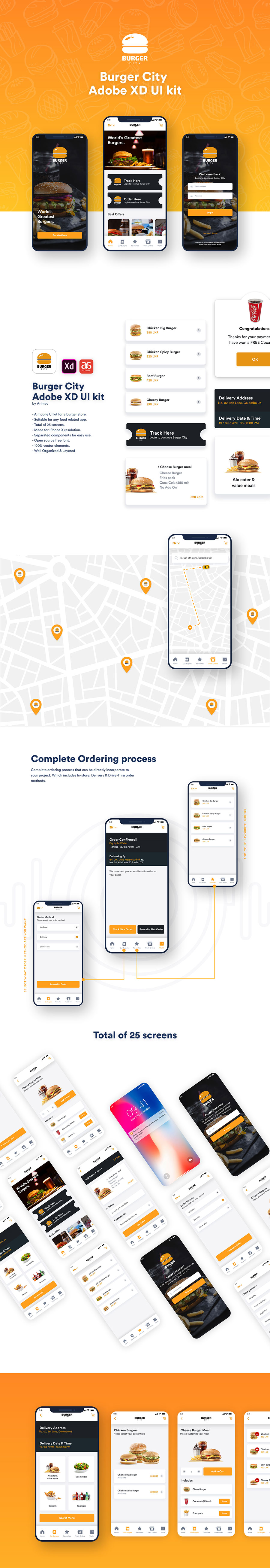 y2403-xd美食橙色UI设计启动页登录页首页注册页地址导航页美食详情页购物车页订单支付页app简洁设计素材源文件下载