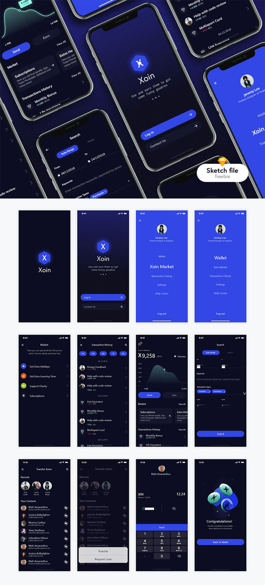 y1996-sketch钱包蓝色Ui设计启动页登录页菜单页列表页聊天页数据页APP高端大气设计素材源文件下载