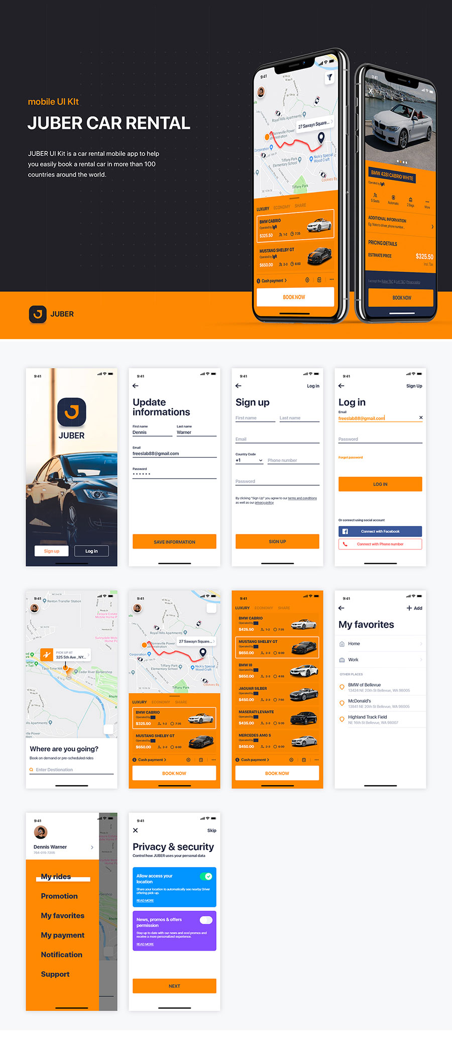y1657-sketch租车橙色UI设计登录页注册页导航页行程页列表页侧滑菜单页APP简洁设计素材源文件下载