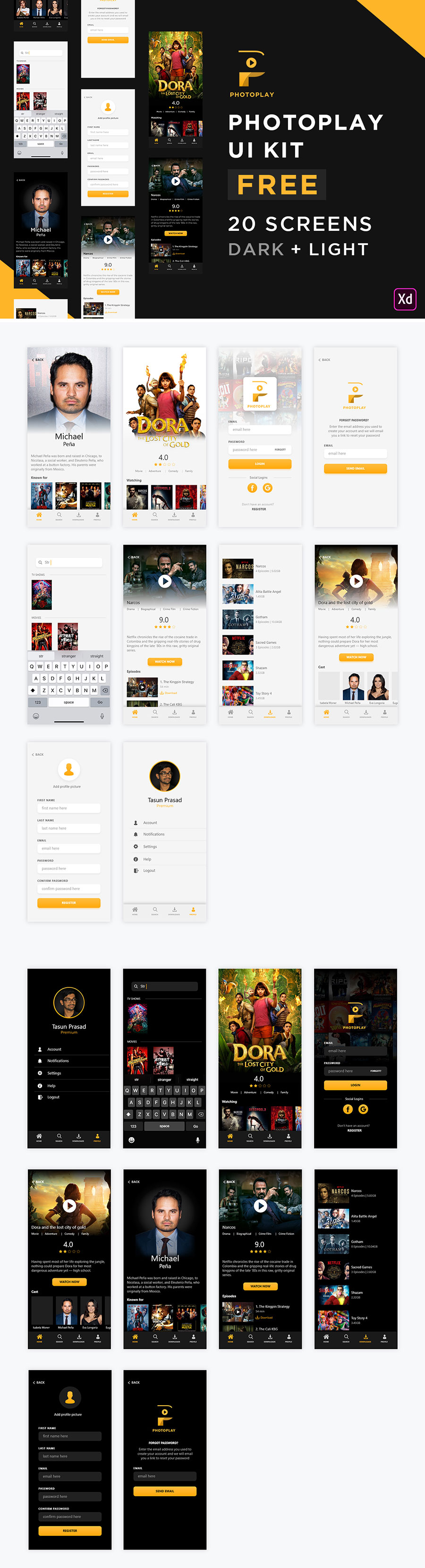 y1572-xd电影黑色黄色UI设计登录页搜索页个人中心页播放页详情页APP高端大气设计素材源文件下载