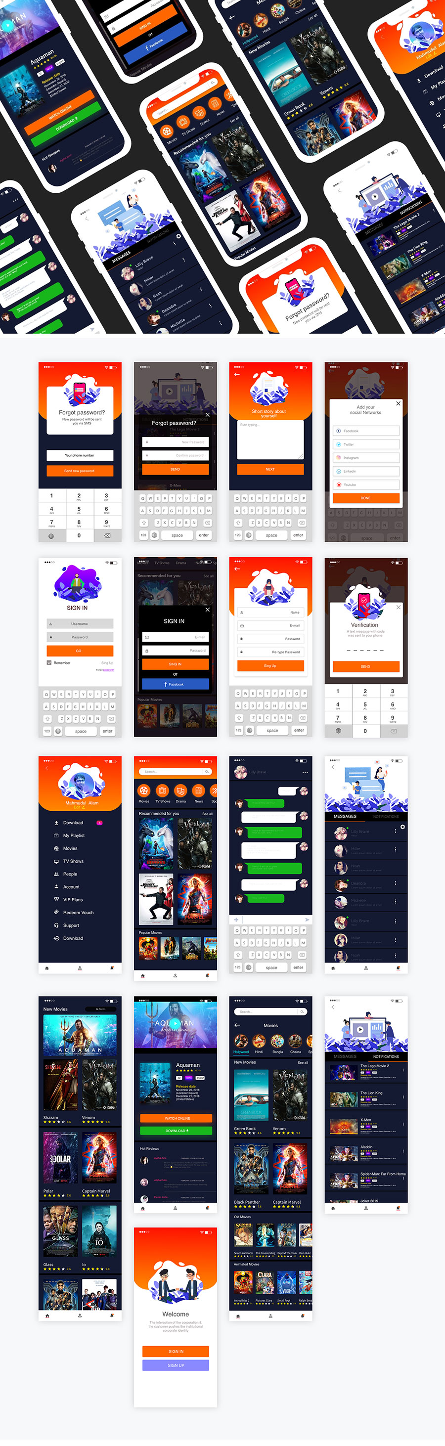 y1571-xd电影橙色UI设计登录页注册页菜单页首页聊天页列表页APP高端大气设计素材源文件下载