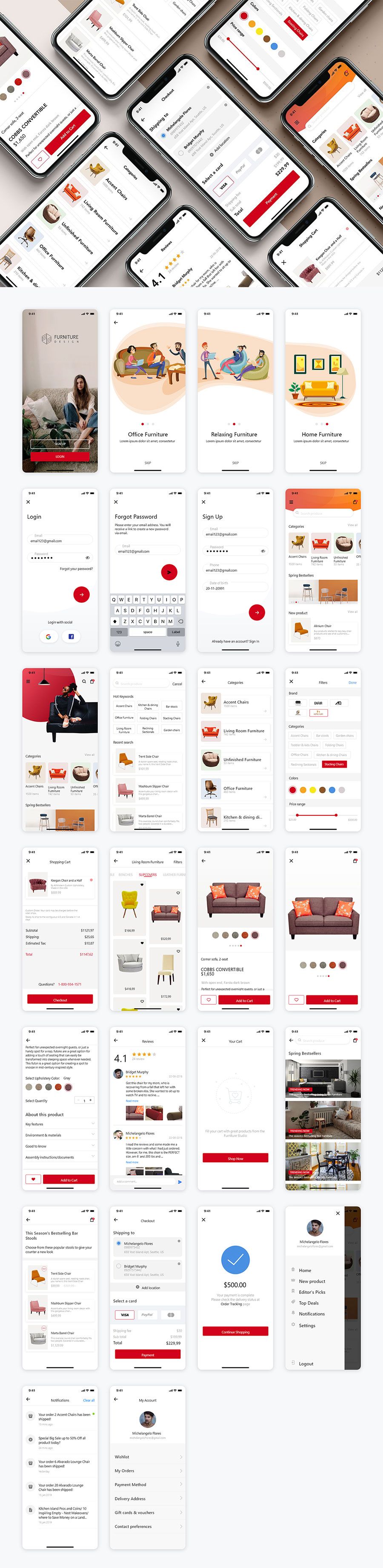 y1523-xd家居电商红色Ui设计登录页注册页启动页首页列表页订单页筛选页支付页个人信息页侧滑菜单页APP简洁大气设计素材源文件下载