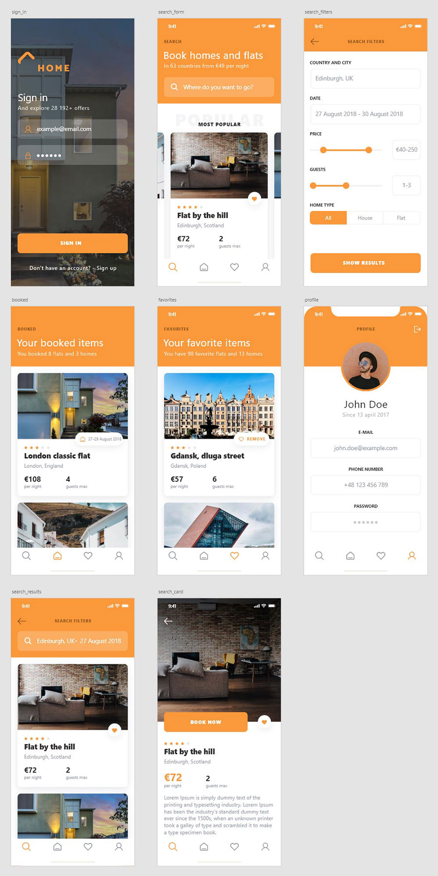 y1480-xd房屋橙色白色UI设计登录页首页筛选页动态页详情页个人中心页APP简洁设计素材源文件下载