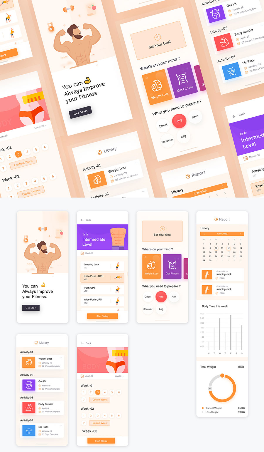 y1427-xd健身橙色UI设计启动页列表页数据页日历页APP简洁大气设计素材源文件下载
