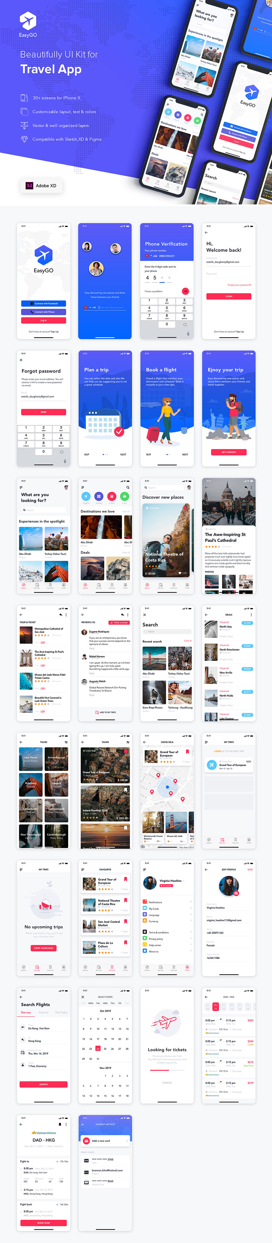 y1388-xd旅行蓝色红色UI设计登录页验证页注册页引导页首页搜索页列表页导航页个人中心页日历页行程页APP简洁大气设计素材源文件下载