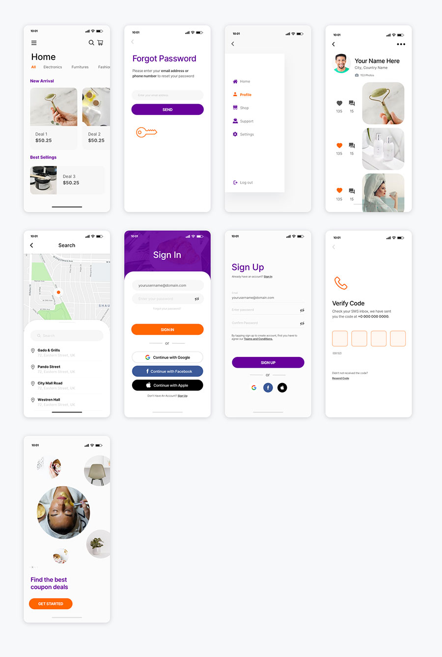 y1680-xd_sketch多用途UI紫色白色UI设计首页登录页侧滑菜单页导航页验证页启动页APP简洁设计素材源文件下载