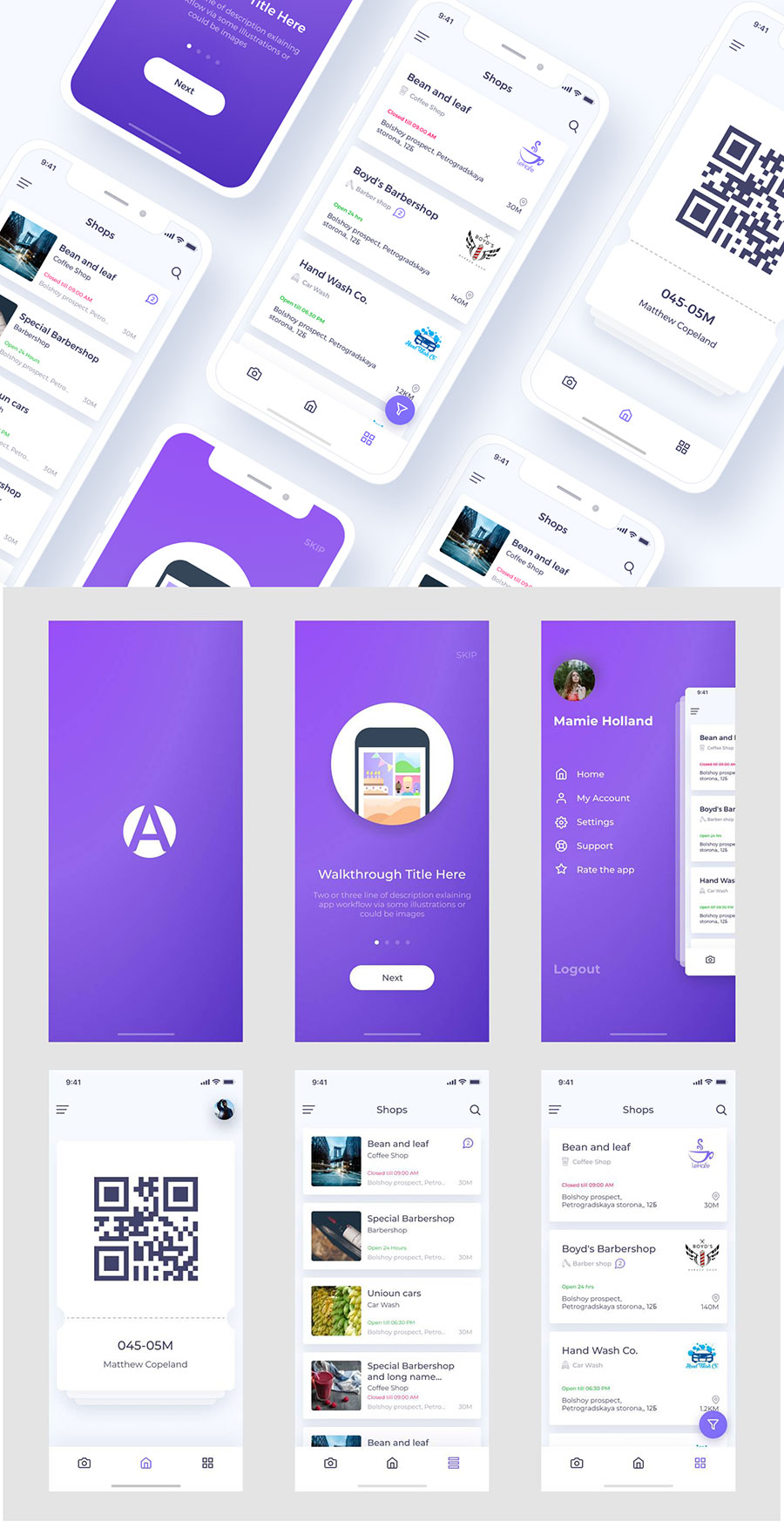 y1940-sketch商品紫色UI设计启动页引导页侧滑菜单页二维码页列表页APP简洁设计素材源文件下载
