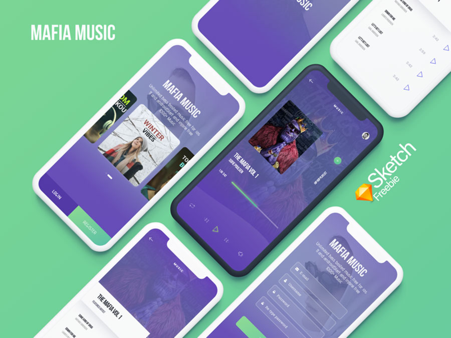y1809-sketch音乐紫色UI设计播放页登录页引导页列表页APP简洁设计素材源文件下载