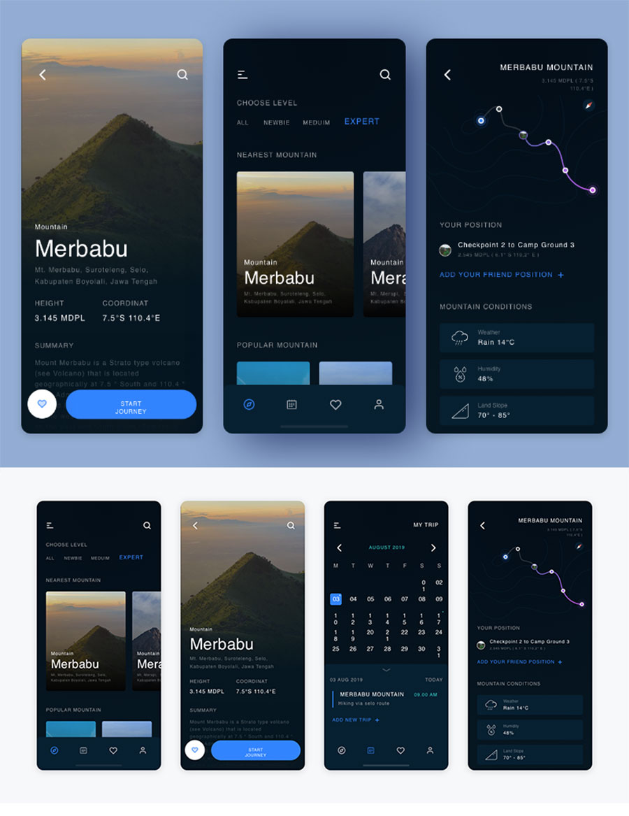 y2014-sketch爬山旅行蓝色黑色UI设计首页数据页行程页日历页APP高端大气设计素材源文件