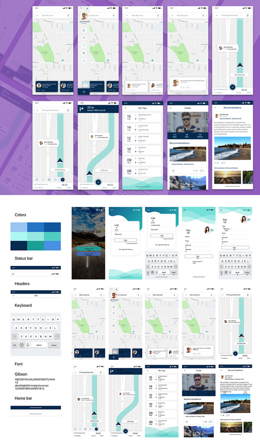 y2094-sketch旅行绿色地图UI设计登录页注册页导航页列表页APP简洁设计素材源文件下载