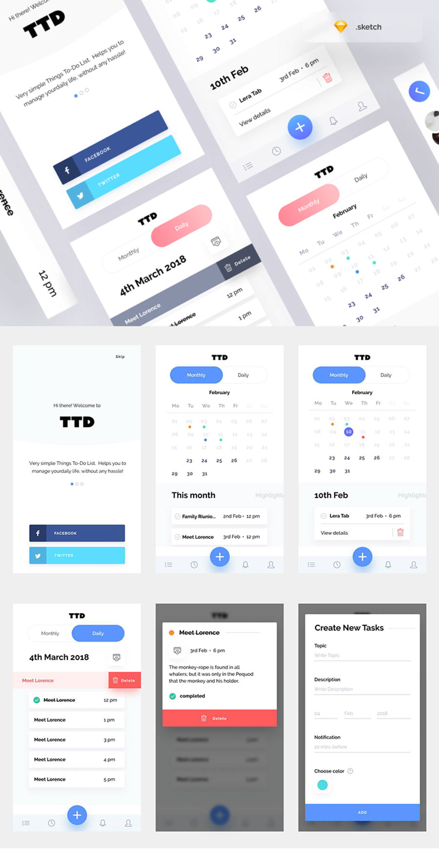 y2064-sketch日历蓝色UI设计登录页日历页侧滑菜单页个人信息页APP简洁设计素材源文件下载