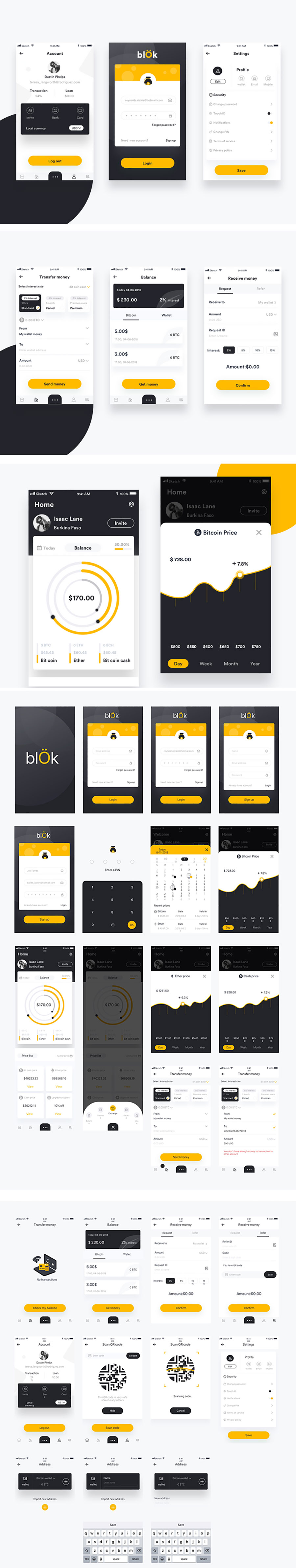 y2646-sketch区块链金融黄色黑色白色UI设计个人中心页设置页钱包支付页数据页启动页登录页密码页日历页缺省页二维码页APP极简设计素材源文件下载