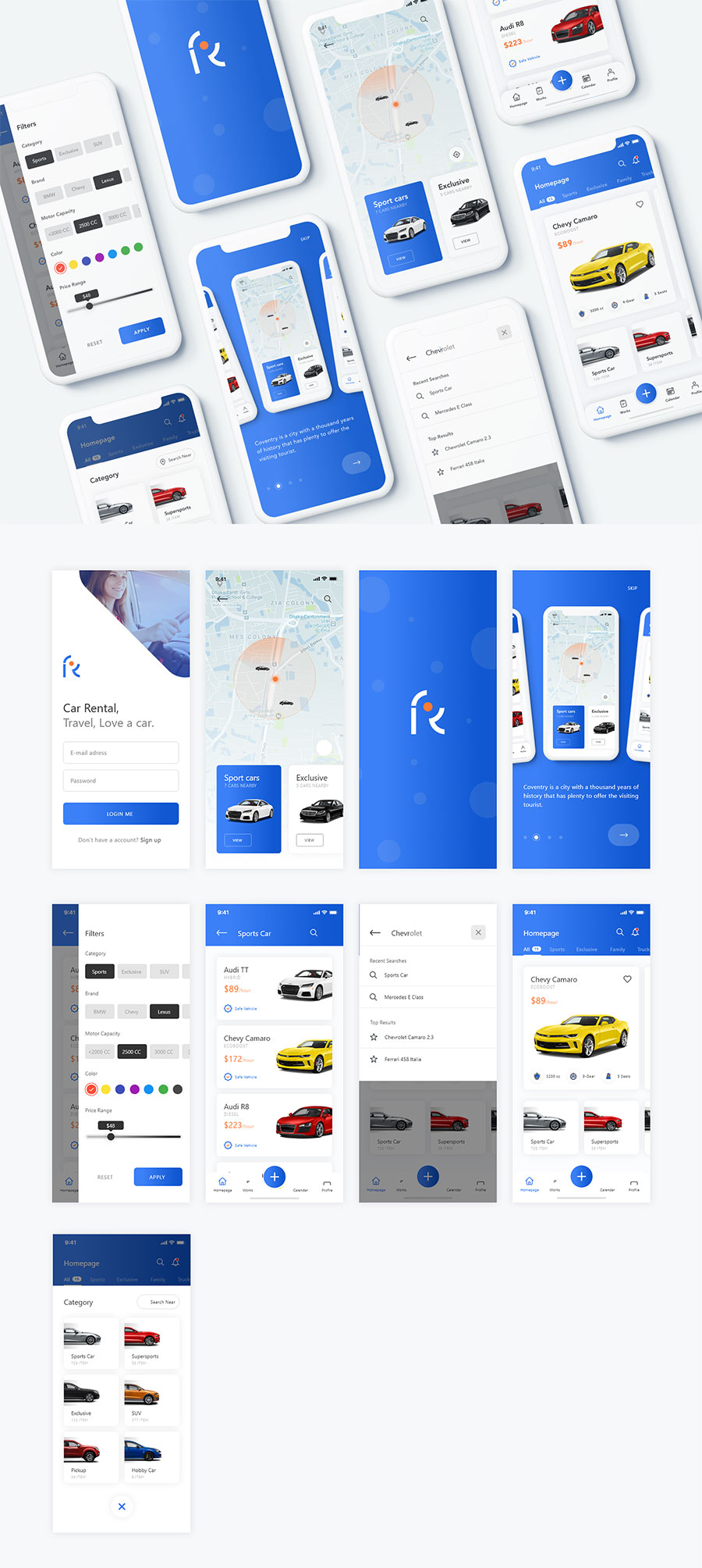 y2578-sketch租车蓝色白鹅UI设计侧滑菜单页导航页登录页启动页引导页汽车列表页APP极简大气设计素材源文件下载
