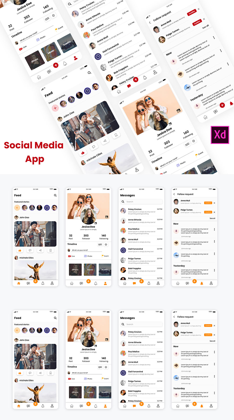 y1258-xd社交橙色白色红色UI设计首页个人中心列表APP简洁大气设计素材源文件下载