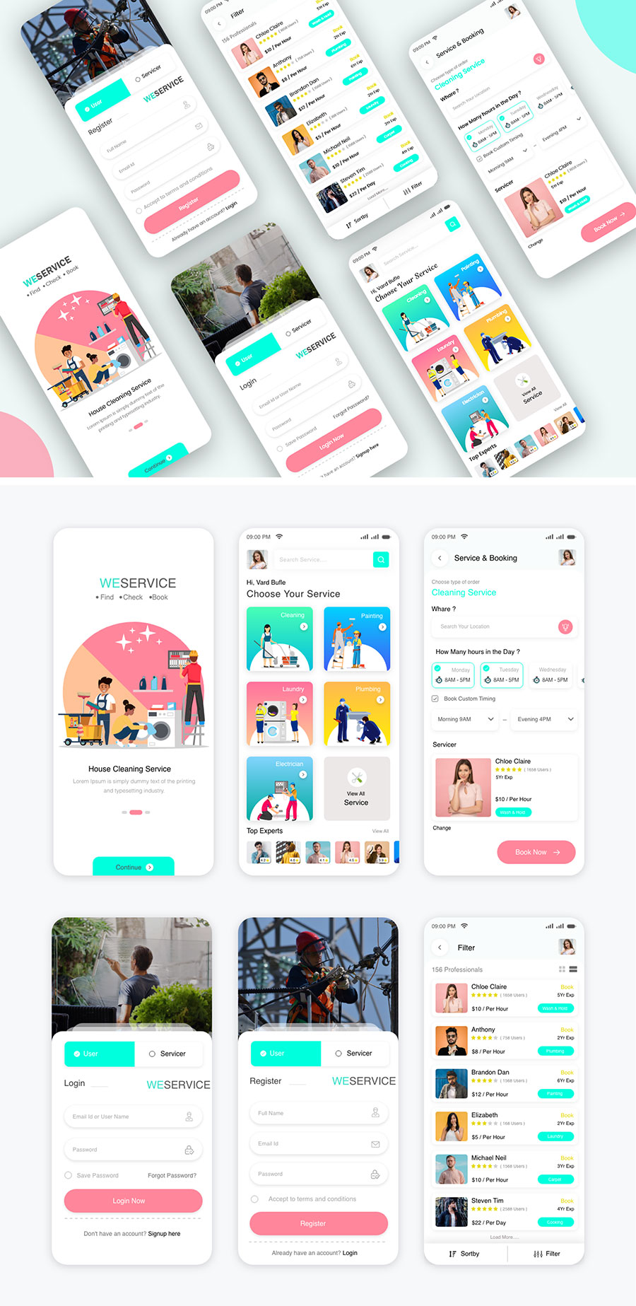 y1417-xd家政红色绿色UI设计启动页搜索页登录页注册页列表页APP简洁设计素材源文件下载
