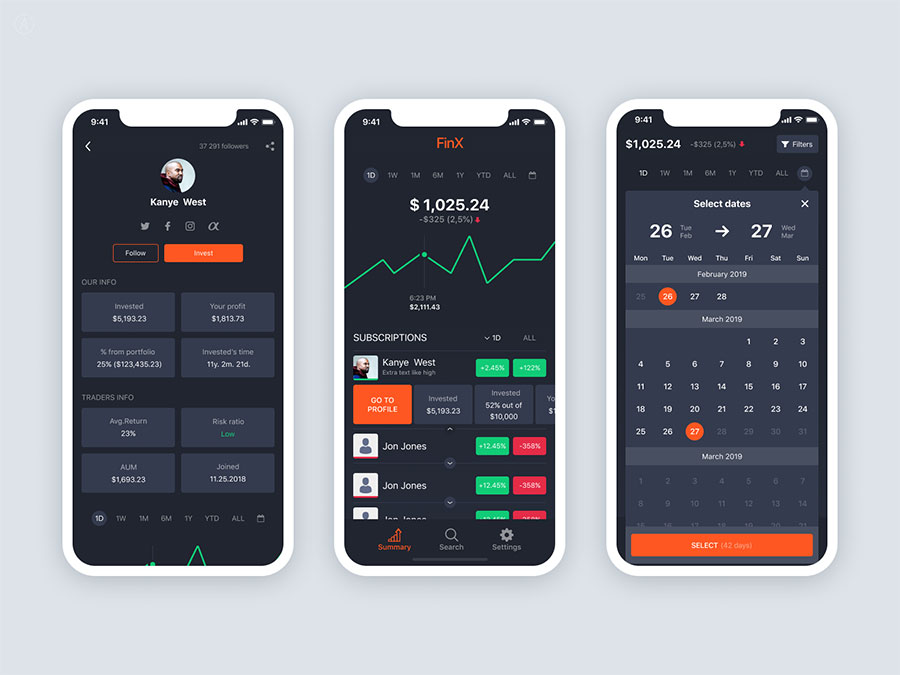 y3139-fig金融黑色UI设计个人中心页数据页日历页APP简洁设计素材源文件下载