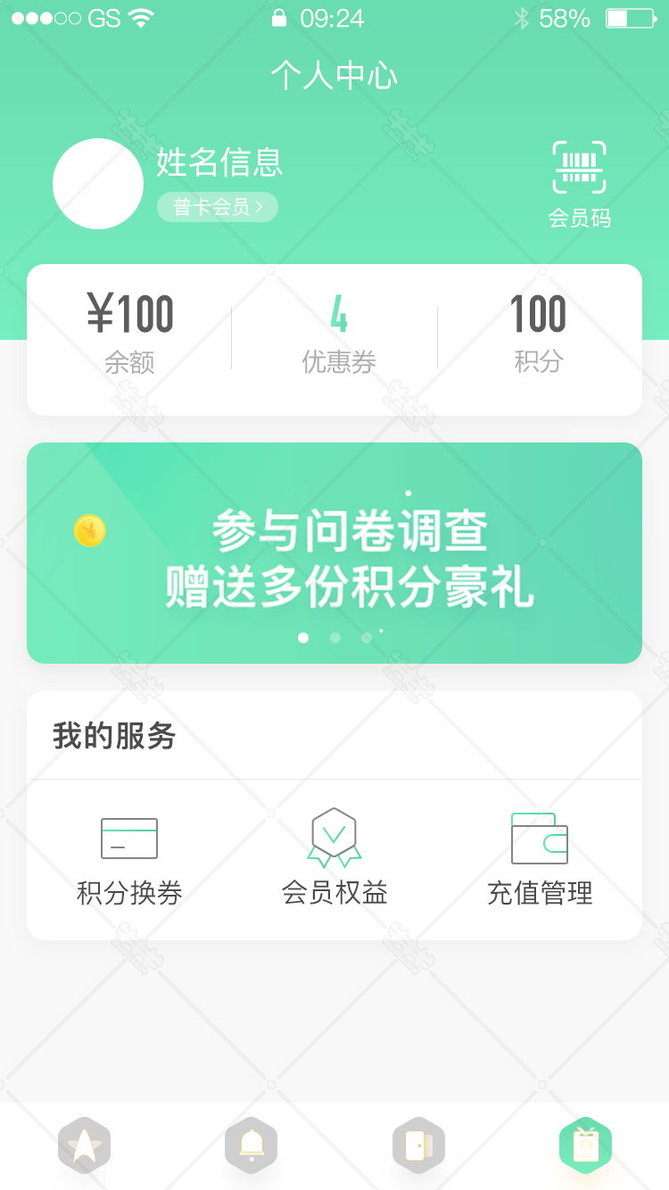 首页>移动ui>y199-扁平绿色ui设计移动端界面我的会员中心psd模板会员扫码积分充值app简洁大气