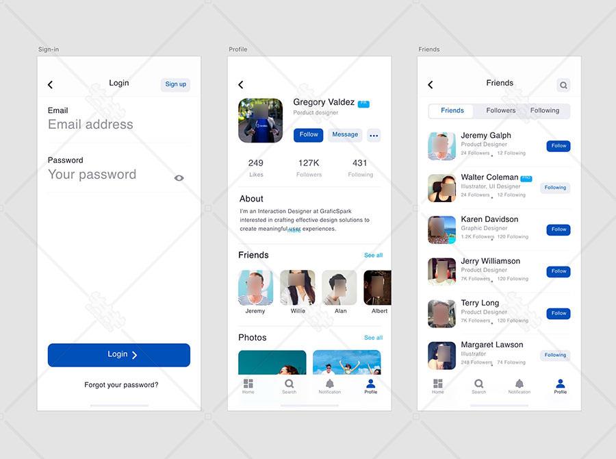 sketch 简约 社交 app 页面 登录 注册 个人中心 我的 首页 列表页 ui设计 源文件 下载 蓝色