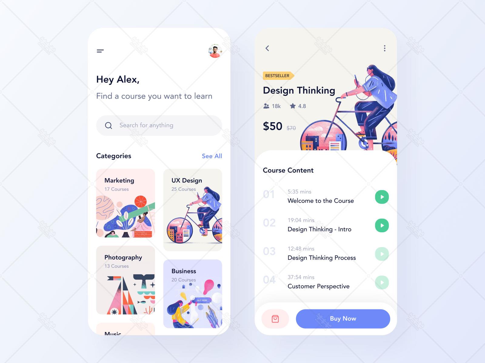 y595-fig扁平插画在线教育app购买试听播放专辑列表ui设计源文件下载蓝色