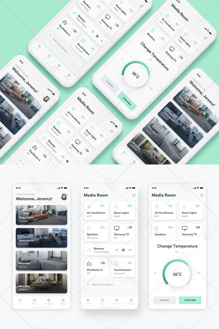 sketch 智能 家庭 操作 控制 电器 设备 app ui设计 源文件 模板 下载 绿色 扁平 首页 列表页 温度 控制 物联网 科技
