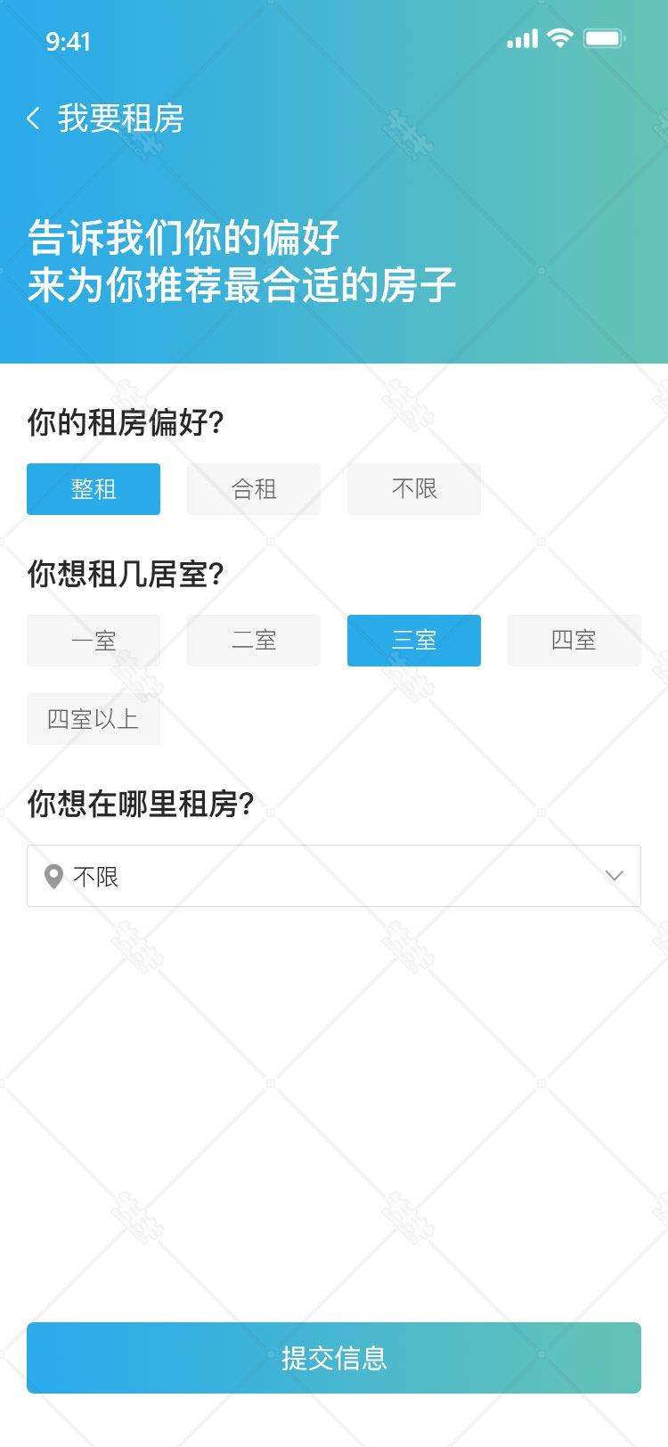 蓝色 渐变 app 手机 房屋 我要 租房 买卖房 类型 选择 ui设计 psd 模板 源文件 下载