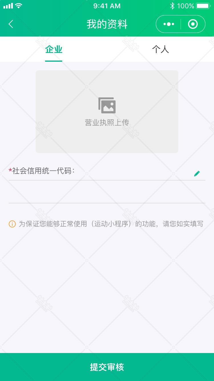 个人中心 我的 资料 企业 营业执照 上传 认证 绿色 渐变 运动 小程序 ui设计 psd 模板 源文件 下载 简洁 清爽