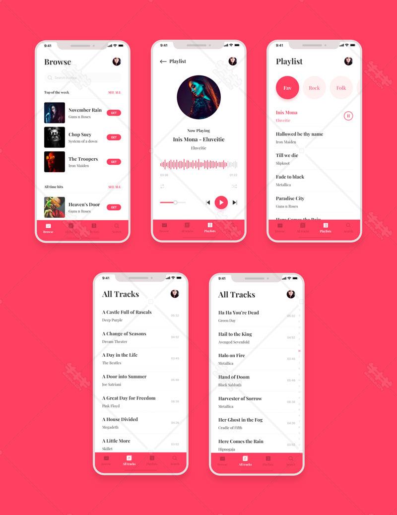 首页>移动ui>y175-xd粉红色简洁音乐播放器UI设计移动端APP设计源文件下载