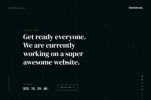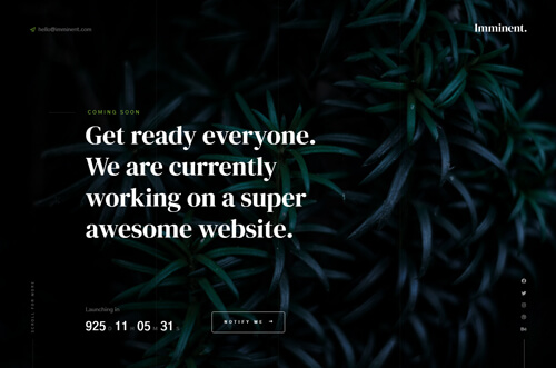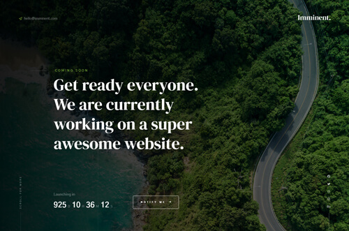 Imminent is a modern and elegant free coming soon website template. A fully-featured, handcrafted website template built with attention to details. You're gonna love its beautifully designed hero banner with its subtle animation and nice typography. It has a nice animated countdown timer, subscription form, tabs where you can put additional information about your site. It comes in three style variants: static, slideshow and particle background. Also, the code behind this template is clean, organized and well-commented making it easy to customize.