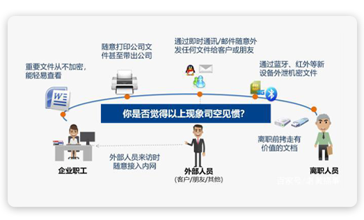 1、文档操作管控:完整审计内部网络中的文档使用与传播全过程,发现违规使用行为,防止文档非法篡改或泄漏。 2、文档打印管控:有效审计每一次打印操作,灵活的控制打印权限,防止纸质渠道的信息外泄与打印浪费。 3、即时通讯管控:完整地审计QQ、MSN、阿里旺旺等即时通讯工具的聊天记录,防止重要文件经由即时通讯工具泄漏。 4、邮件管控:帮助记录和审计用户收发的电子邮件,发现违规行为,同时控制电子邮件收发,防止重要信息泄漏。