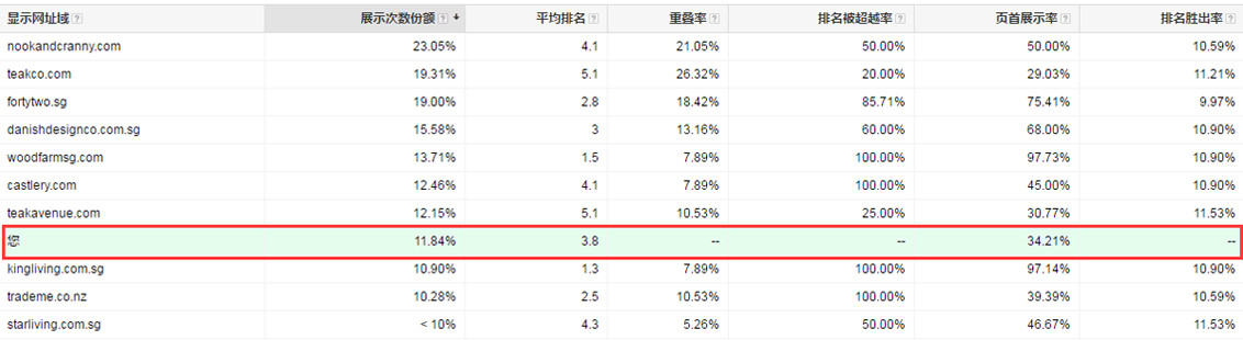 • 目前您比竞争对手少近12%的展示份额。举例:每100次的展示量,您就错过了12次的展示机会。