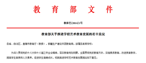 2014年01月14日,教育部在其官方网站发布1号文件《关于推进学校艺术教育发展的若干意见》,意见第8条明确指出,2015年开始对中小学校学生进行艺术素质测评。艺术素质测评纳入学生综合素质评价体系以及教育现代化和教育质量评估体系,并将测评结果记入学生成长档案,作为学生中考和高考录取的参考依据。