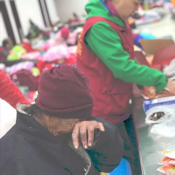 志愿者们在整理物资时,老人们总是想帮着做点什么,尽管一再让老人们回屋休息,但他们还是会默默地在一旁守着,希望可以帮上忙。