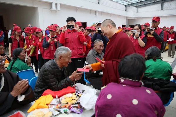 之后,牛牛牛名誉理事长牛牛仁波切为每位老人发放红包、纪念品和爱心礼包,礼包内包括藏糖、暖宝宝、膏药、善存银片、两套保暖内衣等。老人们双手接过每一份礼物,嘴里不断念着“瓜真切(藏语谢谢)”,感动之情溢于言表。