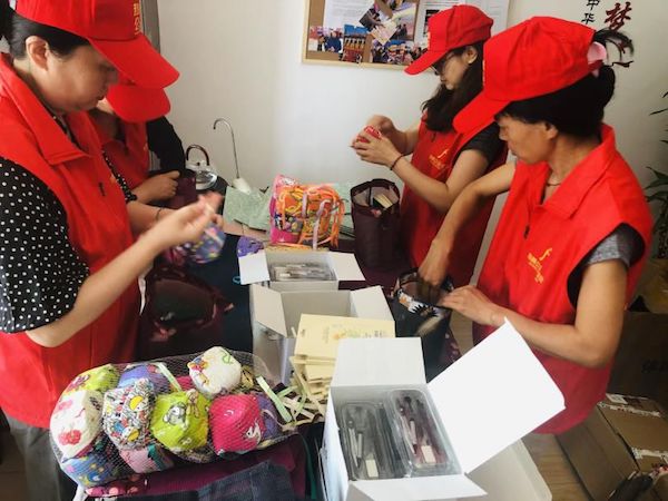 志愿者们分工明确,三人分装,一人核对分装物品,配合的不亦乐乎。