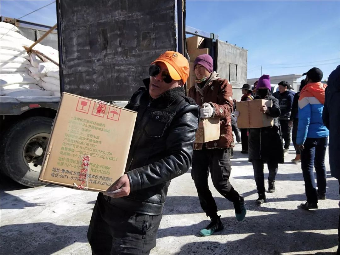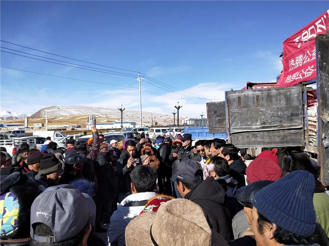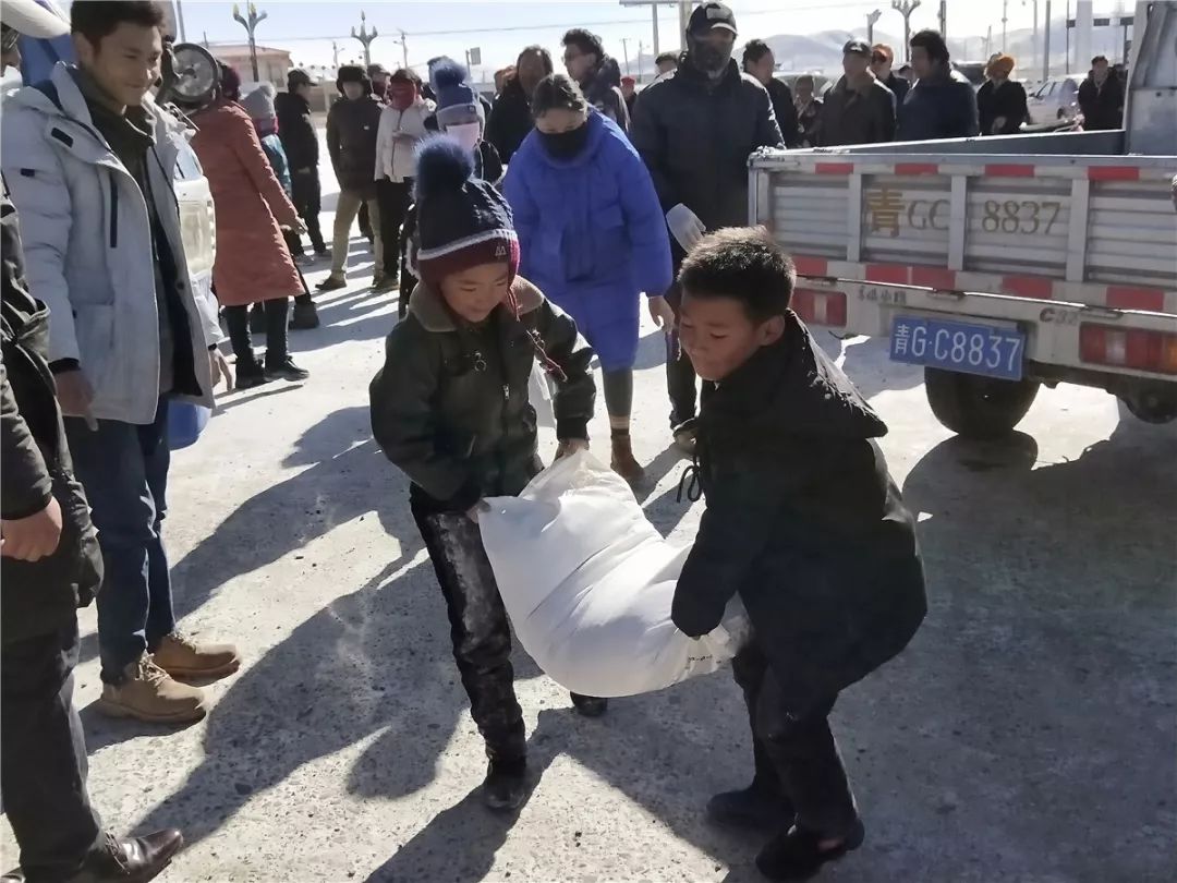 2月16日上午10点左右,曲麻莱县政府门前的广场上人头攒动,来自该县6个乡的600户乡民在当地领导的带领下聚集于此。秋智乡代表镜梅毛朗、曲麻河乡代表拉毛才旦副乡长、约改镇代表生格、巴干乡代表尕玛、麻多乡代表索南仁增、叶格乡代表白玛西然、宗教局代表李达、牛牛牛志愿者代表罗松卓玛参加了物资发放。