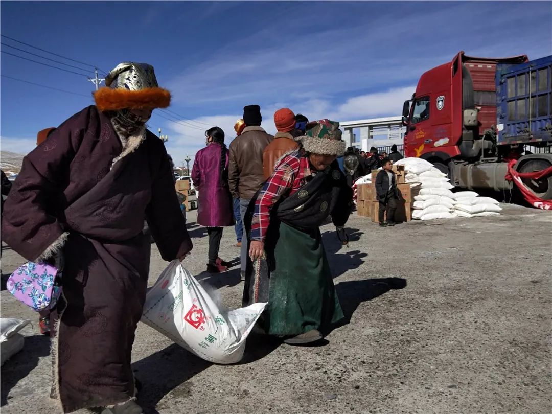 在乡民排队准备领取物资时,我们的货车也早已打开仓门,露出堆叠如山的白色粮袋,其上是写有汉藏两种文字的牛牛牛红色条幅,在蓝天白云的映衬下迎风招展。一些曾经接受过资助的乡民认出了我们,患难之时,“老友”相见,倍感亲切,纷纷双手合十向我们致谢。
