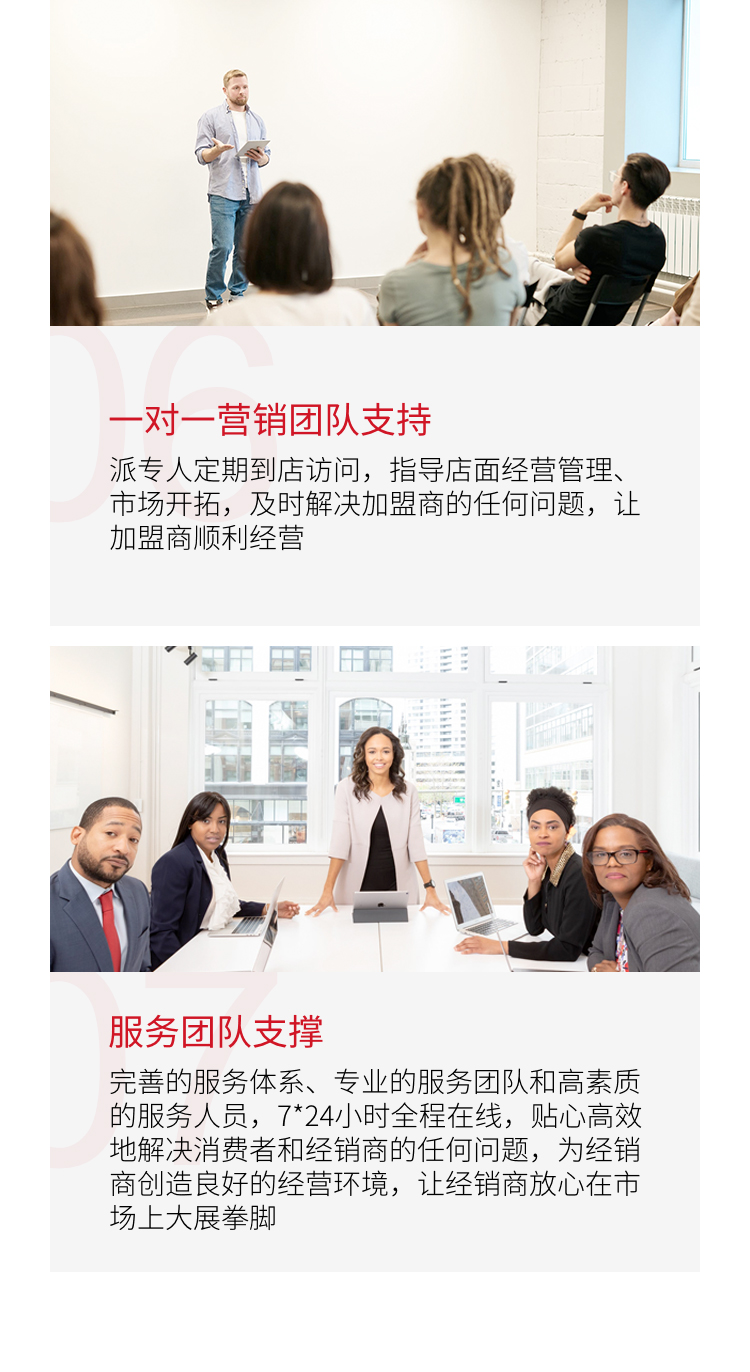 派专人定期到店访问,指导店面经营管理、市场开拓,及时解决加盟商的任何问题,让加盟商顺利经营