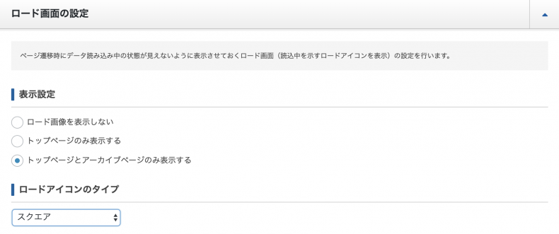 テーマオプションで簡単にオン・オフの切り替えが可能なのに加え、「サークル」、「スクエア」、「ドット」の3種類のロードアイコンと最大表示時間を3~10秒から選択可能です。