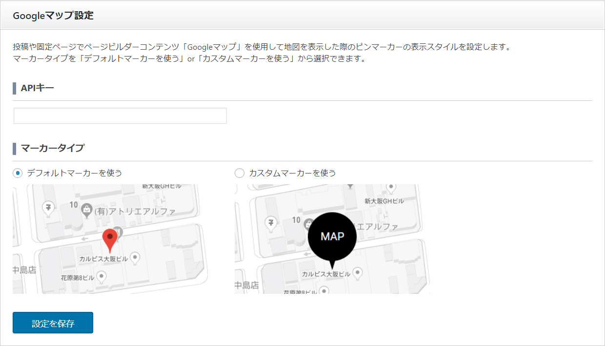 投稿や固定ページ作成などで使用することができるページビルダー機能ではGoogle Mapコンテンツを挿入することが可能ですが、所在地に使用するピンマーカーを従来のピンマーカーに加えて、会社のロゴや会社名を適用することができます。