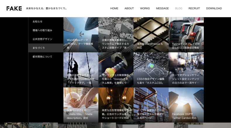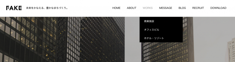 「FAKE」では、コンテンツ量が少なくても美しいサイトが構築できるように意識しておりますので、通常のドロップダウンメニューかメガメニューの2種類から選択することができます。コンテンツが増えてきたら、メガメニューに切り替えるなどの使い方が可能です。