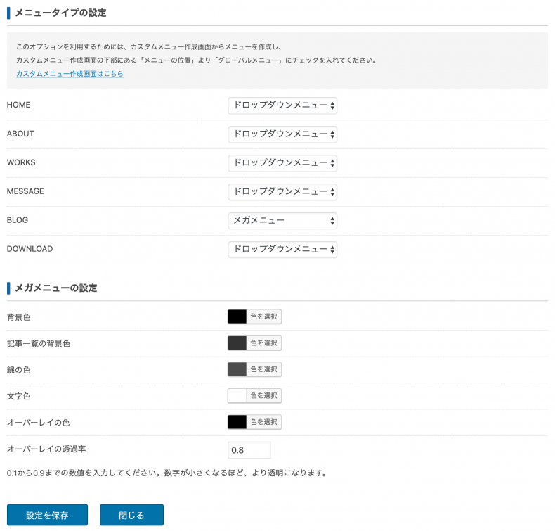 グローバルメニューに設定した項目が下記画像のように、テーマオプションと連動する仕組みになっていて、ドロップダウンメニューから簡単にメガメニューの設定が可能です。