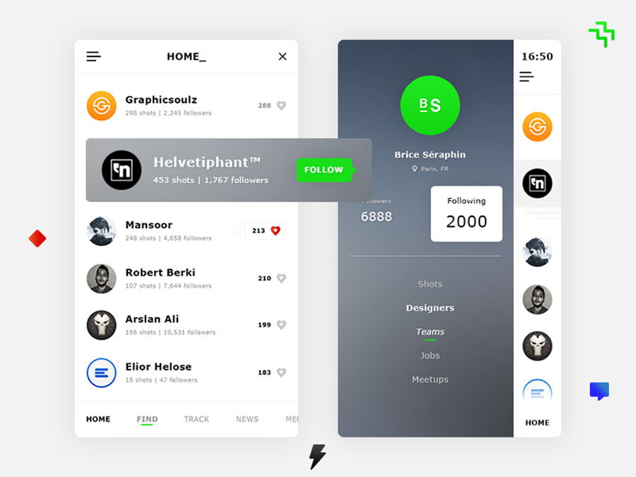 y4280-psd绿色社交社区交友手机移动端app设计ui模板源文件下载极简大气干净关注弹出菜单弹窗图标icon列表页