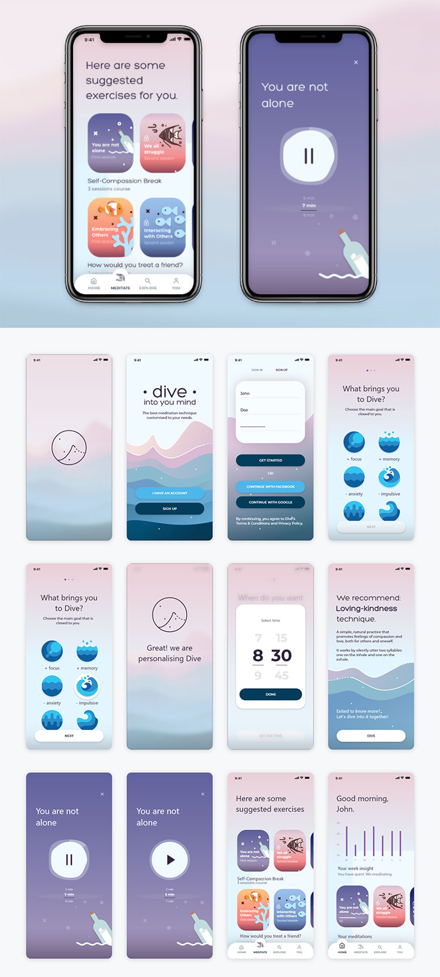 y3086-fig插画创意启动页引导页列表页冥想紫色UI设计首页阅读页播放页个人中心页APP简洁大气设计素材源文件下载