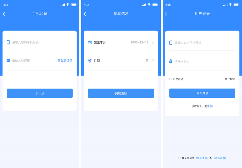 y4361-psd蓝色app手机移动端简洁大气干净ui设计模板源文件下载登录注册页信息提交表单确认