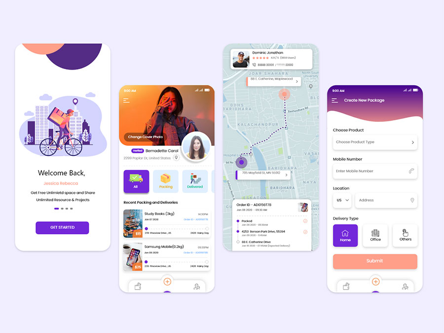 y5278-xd快递运输货运紫色创意扁平插画小哥手机移动端app设计ui素材模板源文件下载全套干净高端物流同城配送o2o