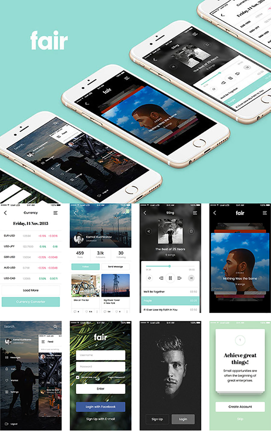 y1985-sketch社交绿色UI设计行情页个人中心页播放页侧滑菜单页登录页APP简洁设计素材源文件下载