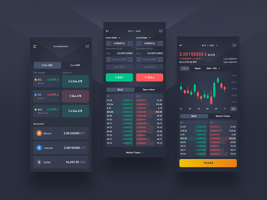 y2041-sketch区块链钱包暗黑色UI设计启动页登录页注册页行情页列表页数据页侧滑菜单页APP简洁设计素材源文件下载